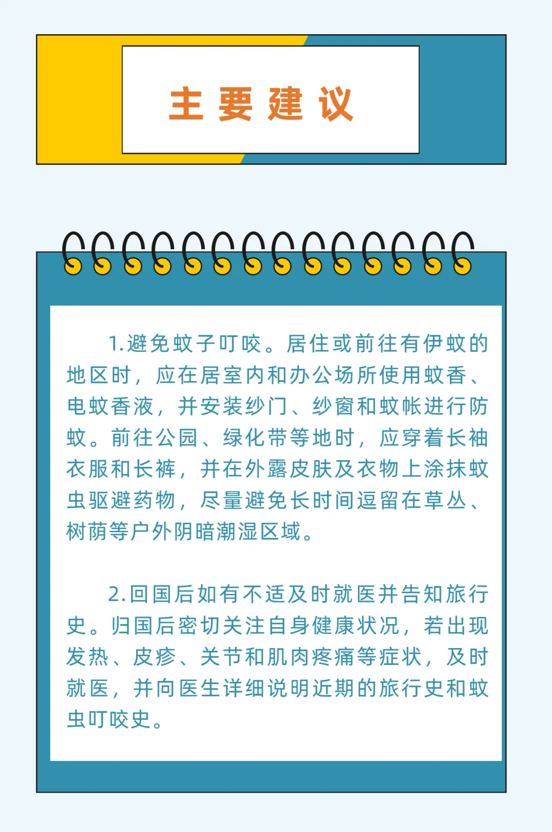 埃及伊蚊、白纹伊蚊叮咬可能感染登革热、基孔肯雅热、寨卡病毒病等蚊媒传染病。春节假期前往热带和亚热带地区旅行,应注意做好防蚊虫叮咬措施。