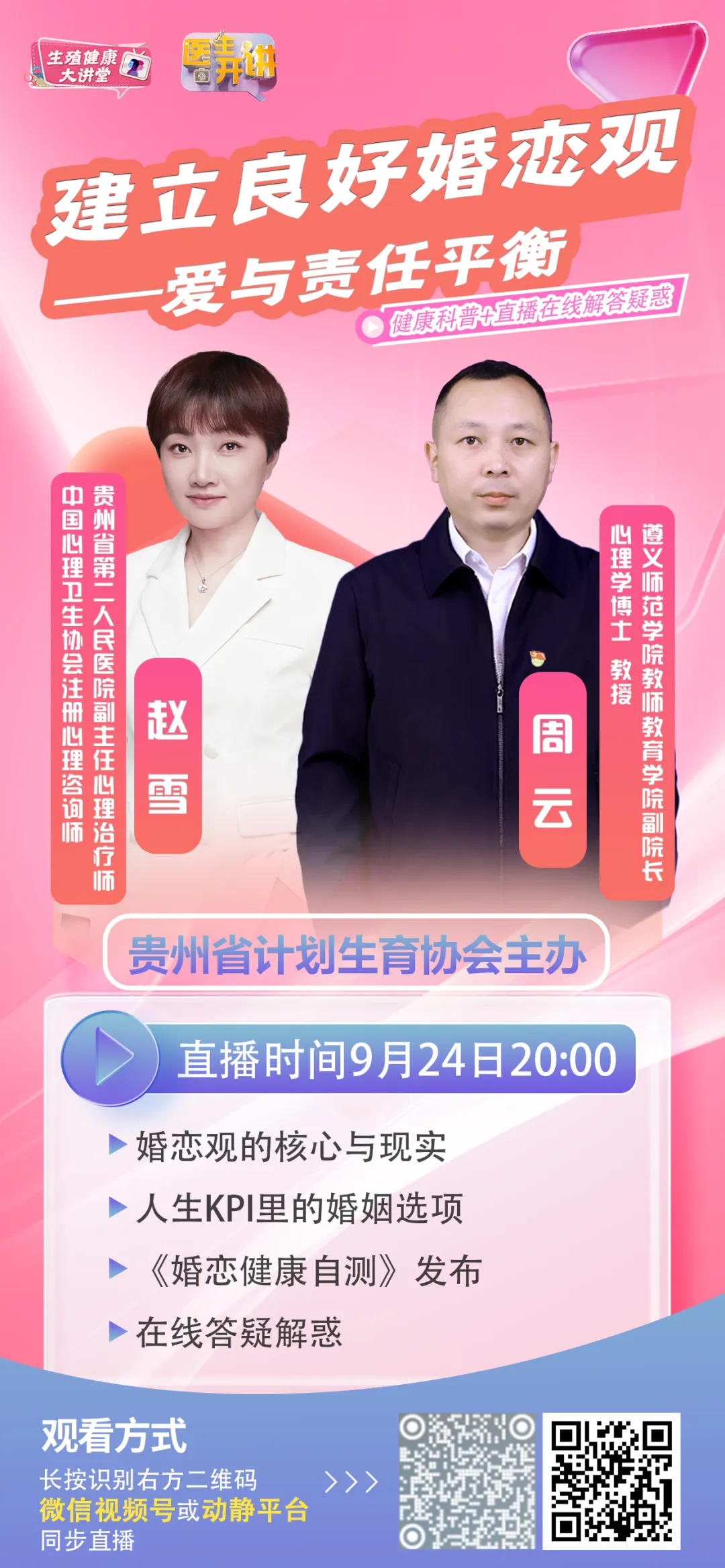 TA是灵魂伴侣还是生活搭子?婚姻是人生必选项还是自由通行证?当“恐婚症”遇上“催婚族”,当“不婚主义”碰撞“丁克文化”,我们该如何在爱与责任的天平上找到平衡点?9月24日晚上8点,“生殖健康大讲堂”第二期《建立良好婚恋观——爱与责任平衡》即将开播,心理学博士周云与资深心理咨询师赵雪将携手打造“婚恋观辩论场”,邀你共同见证思想的交锋。