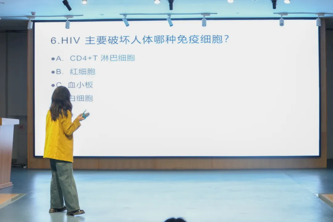 在健康知识宣讲环节,省疾控中心艾防所郑敏老师以《青春要设防 要爱不要艾》为主题,结合真实案例,生动讲解了艾滋病的传播途径和预防措施,强调了自我保护的重要性。省妇幼保健院主任医师张宏红和贵阳市妇幼保健院胡元琴医生则聚焦“消除艾滋病、梅毒和乙肝母婴传播”主题,开展了《消除艾梅乙传播 我们在行动》的科普宣讲、知识竞答和拓展活动。同学们踊跃参与,在轻松愉快的氛围中学习了更多健康知识。