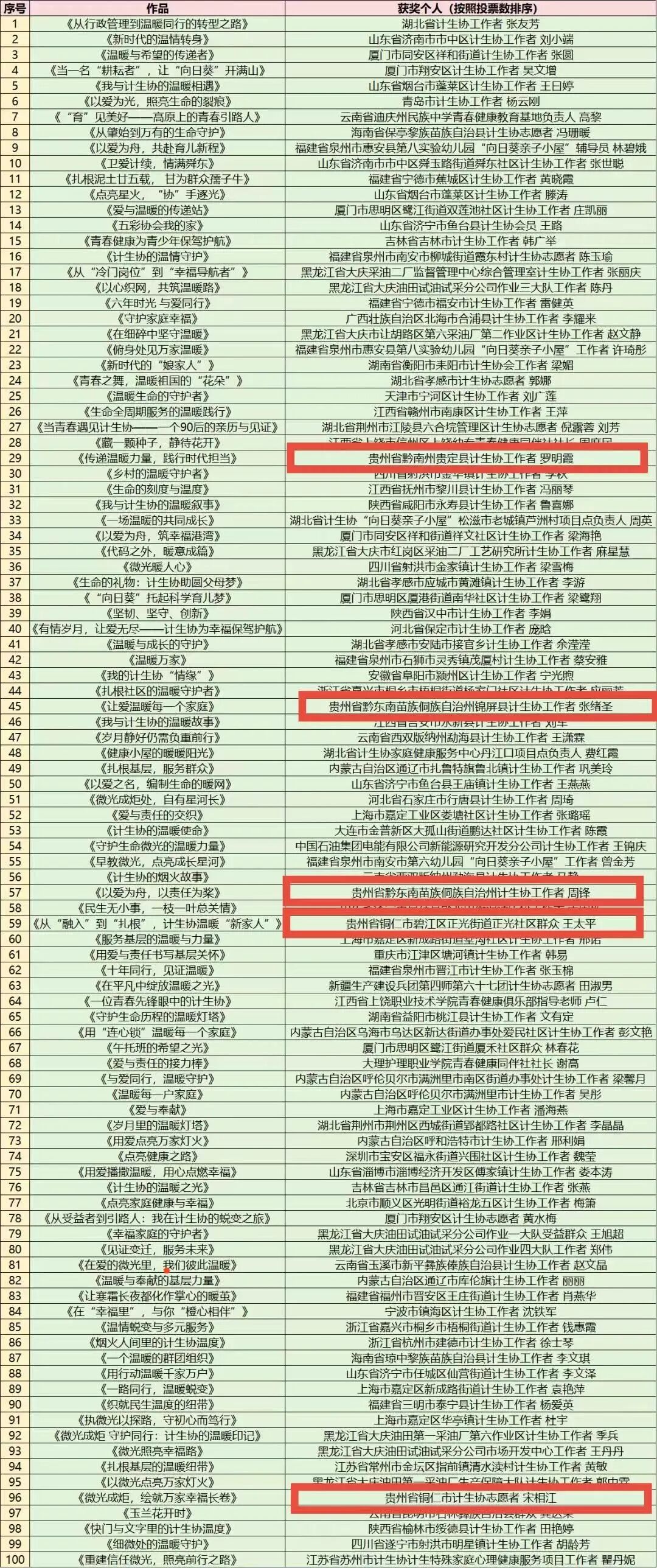 中国计生协近日公布2025年度“我眼中的计生协”征集活动获奖名单。其中,黔东南州计生协周锋、铜仁市计生协宋相江、贵定县计生协罗明霞、锦屏县计生协张绪圣、碧江区正光社区群众王太平等5位同志入选优秀作品投稿个人名单。