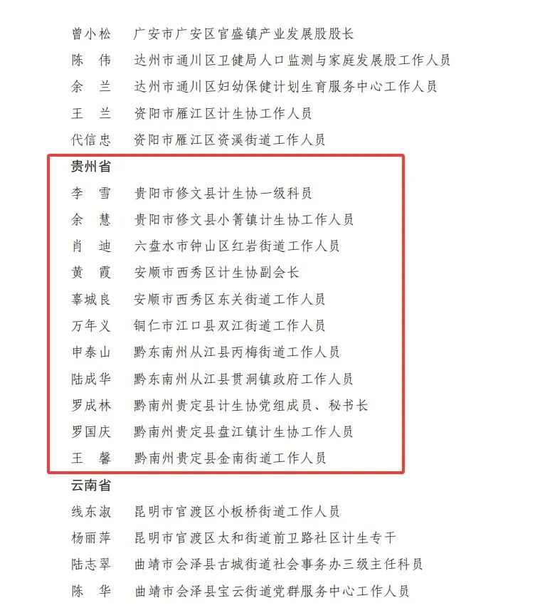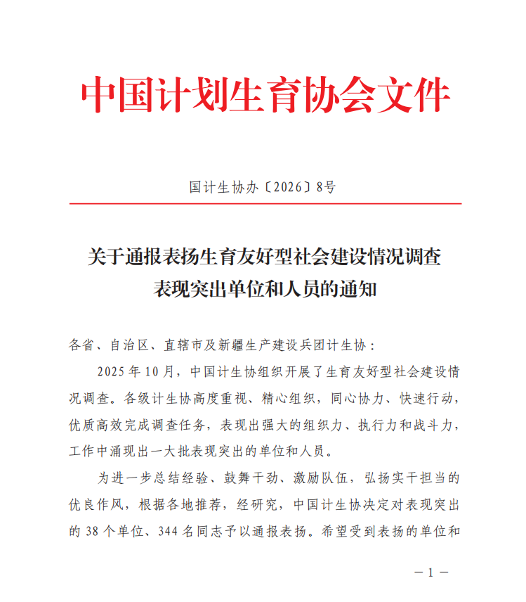 近日,中国计生协印发《关于通报表扬生育友好型社会建设情况调查表现突出单位和人员的通知》,对全国在2025年生育友好型社会建设情况调查工作中表现突出的38个单位、344 名同志予以通报表扬。其中,黔南州贵定县计生协获表现突出单位表扬,李雪等11名同志获表现突出人员表扬。