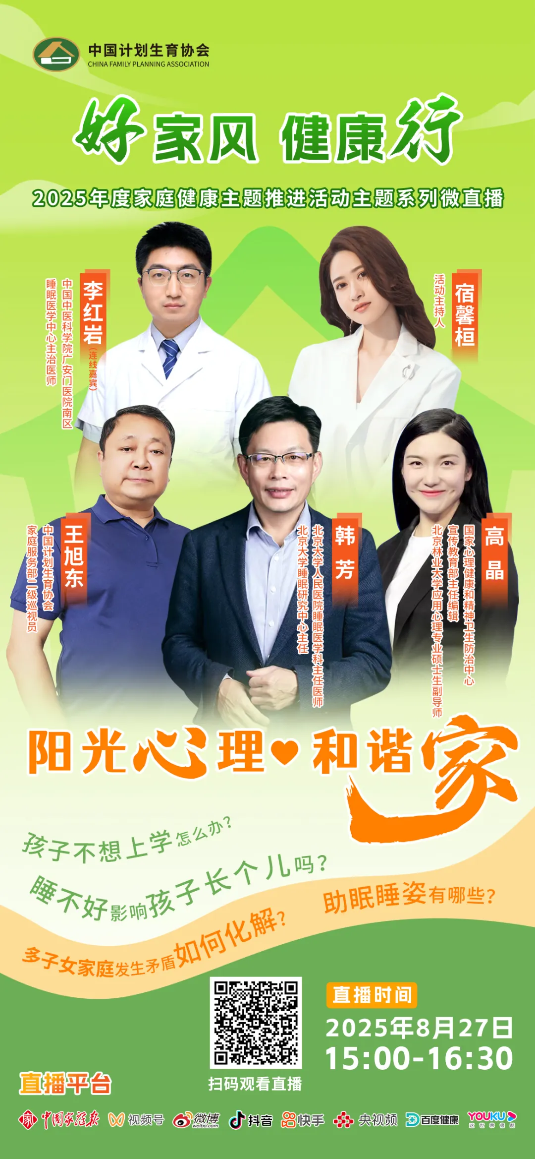 我们如约而至! 就在8月27日,由中国计生协等部门联合主办、中国家庭报社承办的2025年度“好家风·健康行”家庭健康主题推进活动——主题系列微直播,将迎来以《阳光心理·和谐家》为主题的第二期节目,聚焦当今社会和家庭最为关注的心理健康、睡眠健康等方向,邀请心理、睡眠权威“专家天团”进行互动分享,你的这些难题,专家帮你解答!
