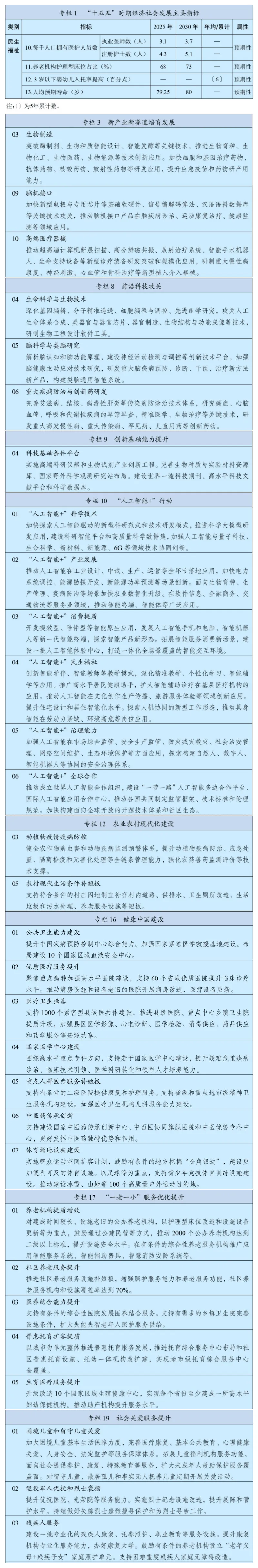 在第二篇“建设现代化产业体系 巩固壮大实体经济根基”中,纲要指出,培育壮大新兴产业和未来产业。加快新一代信息技术、新能源、新材料、智能网联新能源汽车、机器人、生物医药、高端装备、航空航天等战略性新兴产业发展,因地制宜建设各具特色、优势互补的战略性新兴产业集群,着力打造一批成长潜力大、技术含量高、渗透领域广的新兴支柱产业。鼓励发展战略性产品和服务,支持创新药临床使用。瞄准引领未来发展重点领域,构建未来产业全链条培育体系,推动量子科技、生物制造、氢能和核聚变能、脑机接口、具身智能、第六代移动通信等成为新的经济增长点。推进生物医药、智能驾驶、低空经济等新兴领域立法。加快补齐养老、托育、健康等普惠服务短板,健全政府购买服务、公建民营、民办公助等机制,支持多元主体扩大服务供给。聚焦全民健康、智慧养老、文化旅游、到家服务等,培育一批生活性服务业新增长点。加快养老、托育等重点领域服务标准建设,推行优质服务承诺、认证与标识制度。