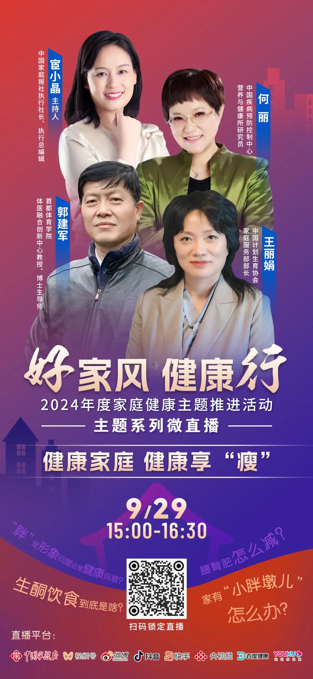 9月29日15:00—16:30,锁定中国家庭报直播平台、微信视频号、新浪微博、抖音、快手、央视频、百度健康、优酷任一平台,与健康相约!
