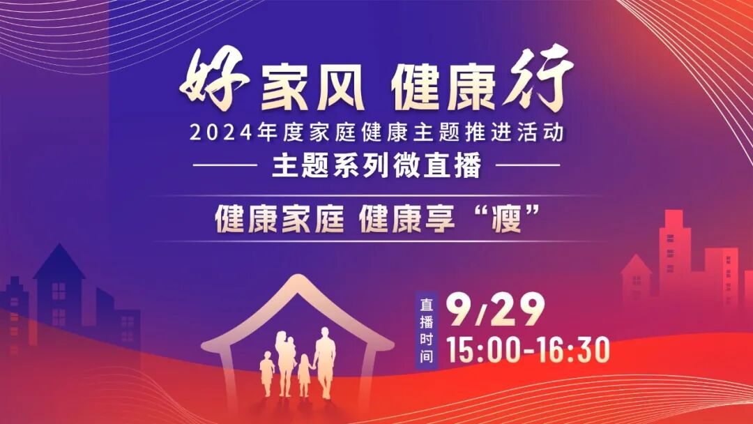 在“十一”来临家国同庆的美好氛围下,中国计生协等部门联合推出2024年度“好家风 健康行”家庭健康主题推进活动——主题系列微直播。首期节目主题为“健康家庭 健康享‘瘦’”,将于9月29日15:00与全国网友见面,诚邀您共赴这场健康知识的盛宴,让爱与健康同行!